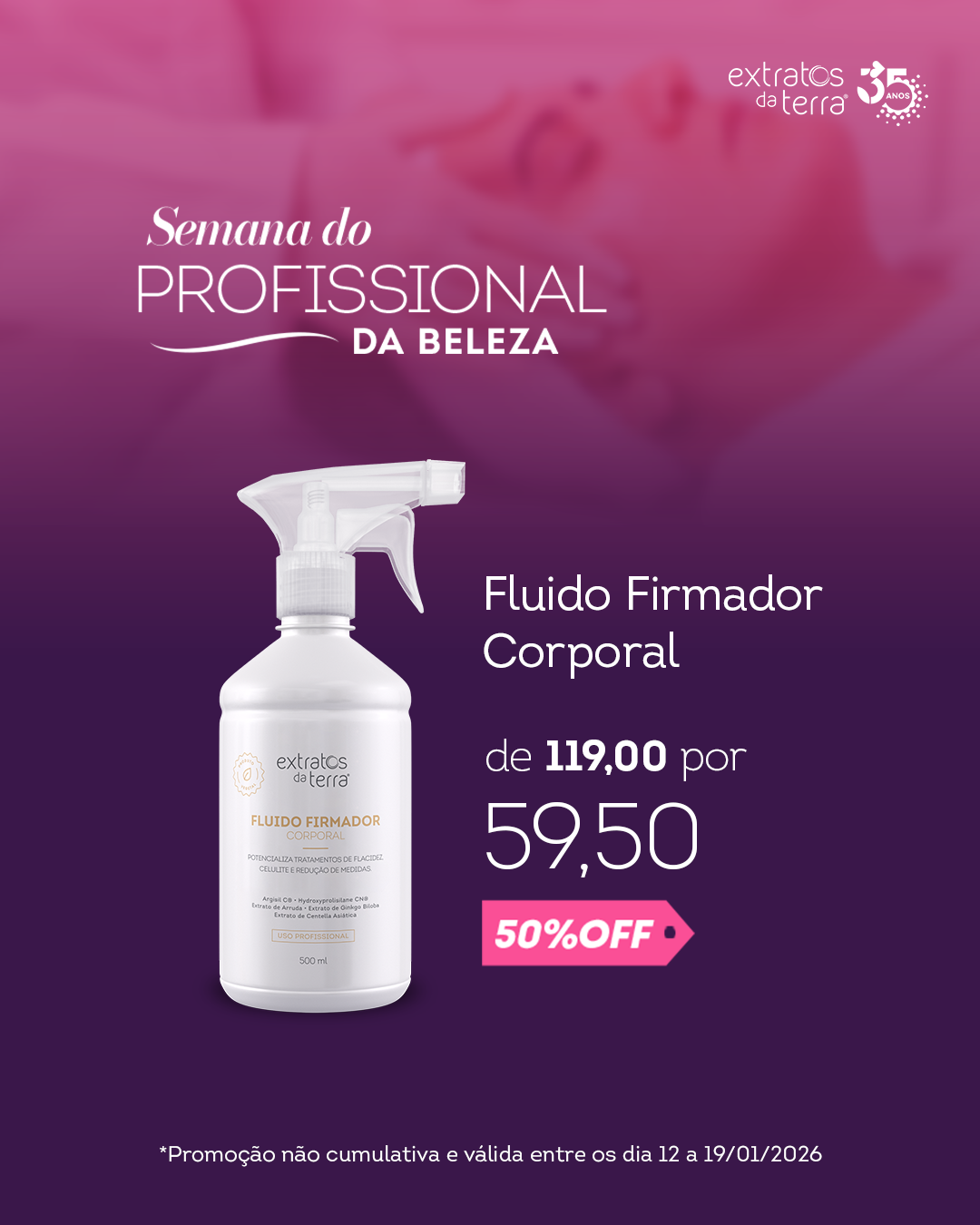 Borrife o Fluido Firmador Corporal para ativar as nanocápsulas do Magic 3C e, em seguida, realize as manobras de massagens estéticas. Para outros tratamentos, aplique-o diretamente sobre a pele antes da massagem ou ionize na polaridade negativa.